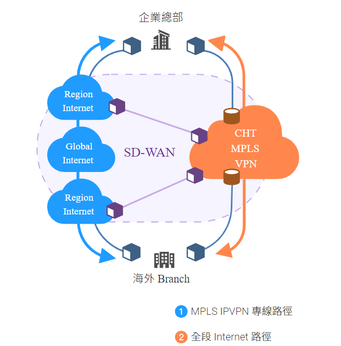 - SD-WAN集中控管元件為 SD-WAN 最重要指揮中心,必須確保其網路及設備的可用性,中華電信於骨幹建置 SD-WAN 集中控管元件,免去客戶自建自維的負擔。