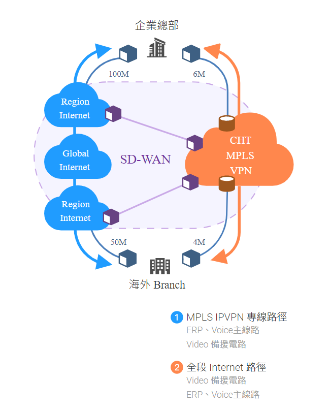 SD-WAN整合MPLS IPVPN、互聯網和移動網路,以提供穩定且靈活的網路基礎設施。多樣性的分流機制