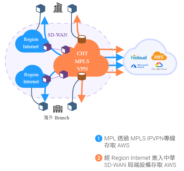 - 客戶利用多種網路就近連結中華電信 SD-WAN 骨幹節點,透過中華電信骨幹連結各公有雲服務。